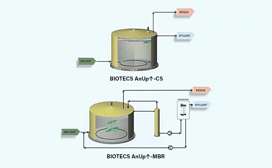 BIOTECS-AnUp↑-C+DBF é um reator anaeróbio de mistura completa - C-Series -, assistido externamente por um separador, que normalmente é selecionado e indicado para o tratamento de resíduos líquidos poluidores que apresentam em sua composição determinados tipos de componentes que dificultam ou não permitem à (ou uma boa) granulação do lodo, tendo como consequência uma maior dificuldade para a separação das fases envolvidas no processo.